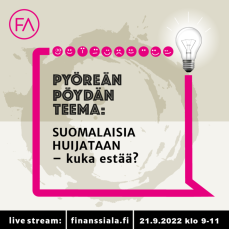 Finanssiala ry:n pyöreän pöydän keskustelut ovat tapahtumasarja, jonka aiheina ovat moninaiset finanssialaa koskettavat kiperät asiat. Puhujina ei ole vain finanssialan edustajia, vaan laajasti sidosryhmiä kunkin käsiteltävän aiheen tiimoilta. Kokonaan verkossa järjestettävät Pyöreän pöydän webinaarit ovat avoimia kaikille.
