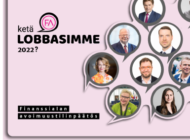 Vastuullisen lobbauksen kantava perusta on avoimuus. Finanssiala ry (FA) julkaisi ennen lakisääteistä avoimuusrekisteriä omaa lobbauksen avoimuustilinpäätöstä 1.1.2020 – 31.3.2024, jossa kerromme, keitä olemme lobanneet ja mistä aiheista. Neljä kertaa julkaistun avoimuustilinpäätökseen päättäjien nimet valikoituivat julkaistaviksi heidän merkittävän poliittisen asemansa vuoksi.