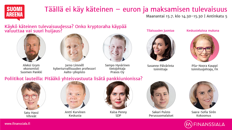 Finanssiala ry:n SuomiAreena-tilaisuudessa maanantaina 15. heinäkuuta maalataan kuvaa lähitulevaisuudesta. Korvaako digitaalinen keskuspankkiraha pian käteisen? Mitä ovat kryptovaluutat, kannattaako rahansa sijoittaa niihin? Entä miten EU:n yhteisen talletussuojan kanssa tulisi edetä? Nämä aiheet selvitetään juuriaan myöten toimittaja Susanne Päivärinnan johdolla Porissa Antinkatu 5:n lavalla kello 14:30. Tilaisuutta voi seurata myös suorana netistä.